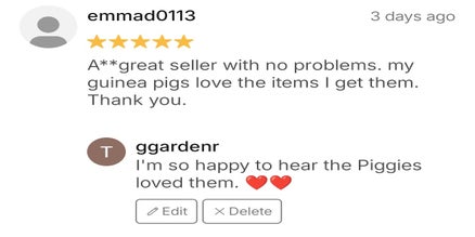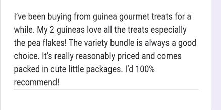 Tara, who runs Guinea Gourmet Treats is always so friendly, always happy to help and makes the best products. I'm a long term subscription customer and I couldn't be happier with the variety and quality I get each month. Fluff pig and Cookie pig would 100% agree