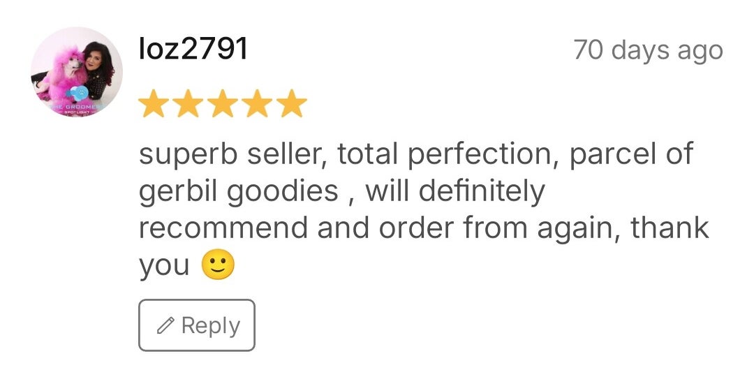 Thankyou so much for my chinchilla Seth's order he loves everything I have from you. It’s very good quality much better than the high street and a lot cheaper too. It’s packaged really well also. I wouldn’t buy from anywhere else. Thankyou 😊