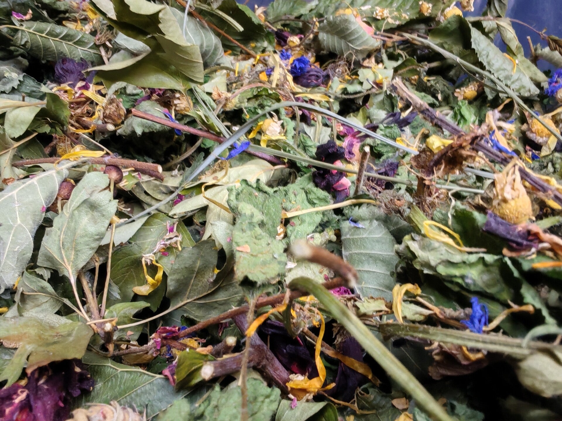A winter forest in a bag — evergreen nettle and hornbeam, red hibiscus petals, and golden chamomile stars.